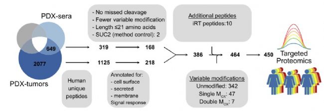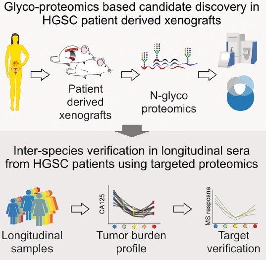 案例三高分級漿液性卵巢癌早期診斷生物標(biāo)志物的研究新策略加拿大Thomas Kislinger教授團隊在Cell Systems上發(fā)表了高級別漿液性卵巢癌相關(guān)研究文章。在這篇研究中,研究者開發(fā)了一個使用臨床相關(guān)患者來源的異種移植物(PDX)和N-糖肽富集的工作流程,使用原位移植的PDX模型,可以在小鼠血清背景中輕松識別“人類獨特的”蛋白質(zhì),從而克服與基于蛋白質(zhì)組學(xué)的生物標(biāo)記物發(fā)現(xiàn)相關(guān)的限制,目的是鑒別腫瘤相關(guān)的人來源蛋白。