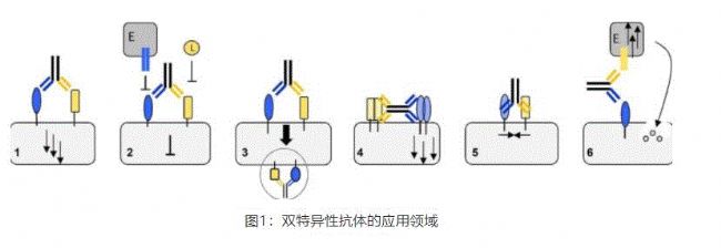 隨著重組蛋白表達(dá)技術(shù)和抗體工程技術(shù)的發(fā)展,產(chǎn)生了許多不同的抗體形式。最佳的抗體結(jié)構(gòu)取決于所期望的生物效應(yīng)及其潛在的結(jié)構(gòu)條件。多特異性抗體用于各種目的,包括(1)受體激活(2)阻斷(3)內(nèi)化(4)聚集,(5)膜相關(guān)蛋白的結(jié)合,或(6)細(xì)胞毒性效應(yīng)細(xì)胞的定向靶點(diǎn)(圖1)。在這些應(yīng)用領(lǐng)域中,下面幾個例子證明了抗體形式對性能的影響。