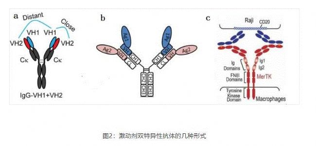 受體激活并誘導(dǎo)下游信號轉(zhuǎn)導(dǎo)以達(dá)到一定的表型是激動劑抗體的目標(biāo)。是等人提出一種IgG形狀,四價,雙翼形式,在每個N-端只包含VH結(jié)構(gòu)域(圖2a)。近距離的抗體結(jié)合部位模擬了天然配體,從而激活內(nèi)分泌成纖維細(xì)胞生長因子FGF21受體(FGFR)。這種獨(dú)特的抗體幾何結(jié)構(gòu)是經(jīng)過精心設(shè)計的,并被證明是激活受體的關(guān)鍵。最近也報道有同樣形式的靶向CD40的激動劑抗體(圖2b)以及一種二價的Y形Surrobody,激活死亡受體DR4和DR5。這種分子顯示出比單一特異性DR4和DR5抗體更強(qiáng)的效力,這表明它具有獨(dú)特的激活機(jī)制。最近,Genentech的抗體工程師設(shè)計了一種簡單的1+1IgG形式的分子(圖2c),通過MerTK(Mer酪氨酸激酶)受體途徑激活巨噬細(xì)胞,導(dǎo)致CD20陽性B細(xì)胞吞噬。