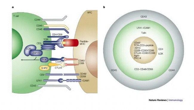 抗原呈遞細(xì)胞(APC)與T細(xì)胞之間的生理免疫突觸(IS)是T細(xì)胞活化的關(guān)鍵。在T細(xì)胞膜上,IS顯示為一個嵌套的環(huán)狀結(jié)構(gòu),常被稱為“bullseye”。中心區(qū)cSMAC(中央超分子激活簇)包含諸如T細(xì)胞受體(TCR)復(fù)合物、共刺激分子CD28、抑制免疫檢查點(diǎn)(如PD-1或CTLA-4)、信號介質(zhì)如Lck(淋巴細(xì)胞特異性蛋白酪氨酸激酶)和PKC(蛋白激酶C),以及穿孔素等細(xì)胞毒性分子。cSMAC被周圍的SMAC(pSMAC)包圍,其中包含許多粘附分子,它們介導(dǎo)細(xì)胞-細(xì)胞的結(jié)合(如LFA1)。遠(yuǎn)端環(huán)(dSMAC)包括抑制性酪氨酸磷酸酶CD45和動態(tài)肌動蛋白。APC和T細(xì)胞之間的膜距離約為13–15nm。試驗表明,一個拉長的膜間距降低了T細(xì)胞的活化,說明較近的距離是必須的,以適當(dāng)?shù)卣T導(dǎo)T細(xì)胞活化。