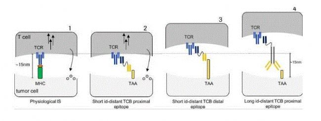 今天,眾所周知,TCBs通過同時結(jié)合靶細(xì)胞上的TCR亞單位CD3ε和TAA來促進(jìn)規(guī)則的細(xì)胞溶解免疫突觸的形成。Offner等人用共聚焦顯微鏡證明,在生理性和抗體誘導(dǎo)的人工突觸之間,來自所有SMAC環(huán)的突觸特異性標(biāo)記的共定位沒有變化。Cartwright和他的同事利用定量熒光顯微鏡和納米級右旋糖酐來分析哪些分子大小可以進(jìn)入IS,以及是否存在引發(fā)IS排斥的大小閾值。他們確定可以證明4到13nm范圍內(nèi)的右旋糖酐可以穿透IS。另一方面,32-54nm之間的大分子被排除在外。他們的假設(shè)進(jìn)一步被NK和腫瘤細(xì)胞之間免疫突觸大小不同的抗體所證實。這些發(fā)現(xiàn)表明,人工免疫突觸的距離很重要,在設(shè)計TCB時應(yīng)該考慮到,TCB可能破壞而不是觸發(fā)突觸的形成。