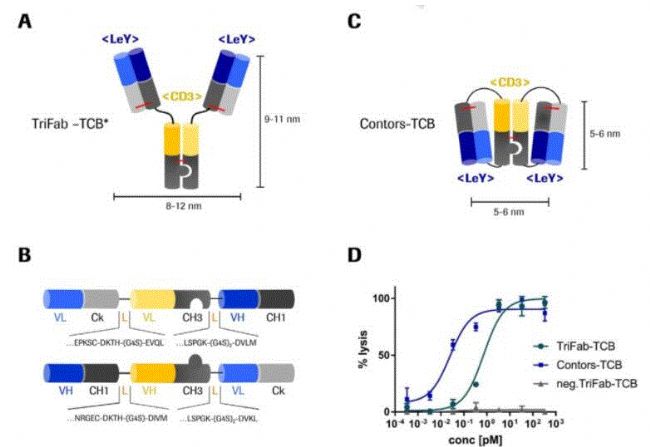 TriFab-Contorsbody格式不僅使兩個結(jié)合基團(tuán)更加緊密地結(jié)合在一起,而且在理想的trans結(jié)構(gòu)中提供了第三個結(jié)合基團(tuán)。使CD3ε結(jié)合更容易,這使得T細(xì)胞和靶細(xì)胞可以同時有效結(jié)合。
