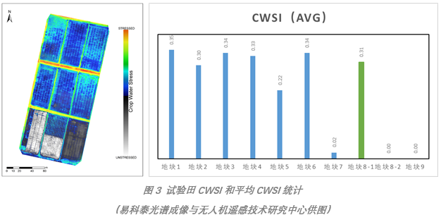 此次飛行作業(yè),獲取了9塊實驗地的多光譜影像數(shù)據、RGB影像數(shù)據、CWSI影像數(shù)據及冠層-土壤溫度影像數(shù)據等,其中1、2、3、4、5、6號地塊為玉米干旱脅迫地,7號地塊為玉米正常地;8-1號地塊為大豆干旱脅迫地,8-2和9號地塊為大豆正常地。通過對遙感監(jiān)測數(shù)據進行NDVI、NDRE、CWSI等專題數(shù)據提取分析,實現(xiàn)了對樣地中農作物脅迫程度、健康狀態(tài)、病蟲害等進行快速評估的效果。