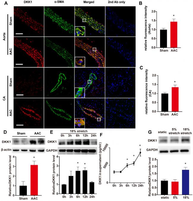 對人 VSMCs 進行了進一步的體外實驗,以驗證 DKK1 響應(yīng)高水平拉伸的變化。使用循環(huán)拉伸加載系統(tǒng),對 HASMCs 進行不同時間長度(0、3、6、12 或 24 小時)的高強度拉伸(18%),HASMCs 和培養(yǎng)上清液都表現(xiàn)出 DKK1 蛋白水平隨時間依賴性增加 (圖1 E、F),而當(dāng)細(xì)胞處于5% 循環(huán)拉伸時沒有觀察到變化。將HASMCs 在無拉伸、正常拉伸 (5%) 或高強度拉伸 (18%) 的情況下處理 6 小時,然后收集細(xì)胞裂解物用于蛋白質(zhì)印跡分析。DKK1 表達在高水平拉伸處理的細(xì)胞中顯著高(P < 0.05,圖1 G)。