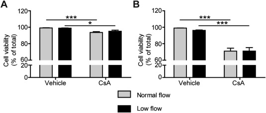 CsA是一種已知的腎毒性物質(zhì),據(jù)報(bào)道可引起內(nèi)質(zhì)網(wǎng)(ER)和線粒體的損傷,并增加PTECs的氧化應(yīng)激。由于 P-gp 活性較低,CsA 誘導(dǎo)的細(xì)胞毒性在低流量下可能更嚴(yán)重,因此,實(shí)驗(yàn)在24 h的流動(dòng)條件和細(xì)胞系中研究了CsA (30 μM) 的細(xì)胞毒性反應(yīng)(圖 4)。