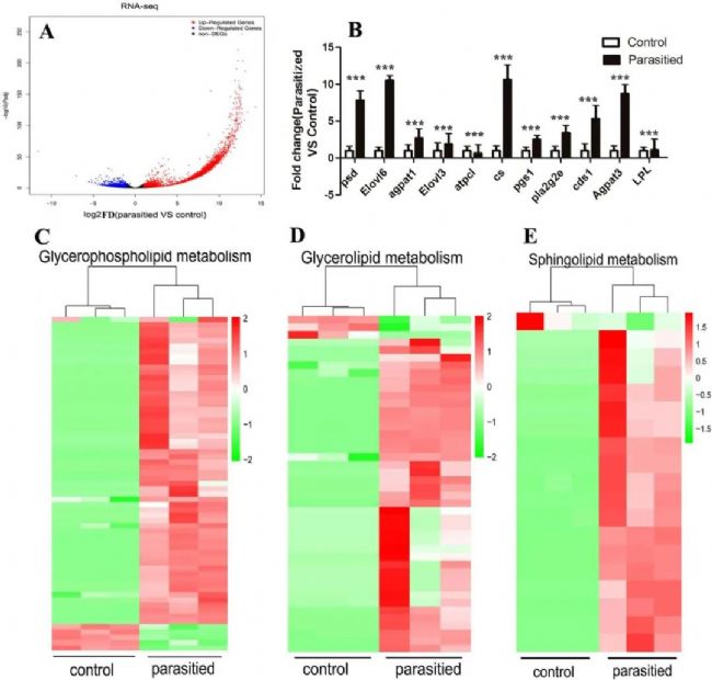 棉岈蟲 (Aphis gossyp ii Glo ver)是種重要的農(nóng)業(yè)害蟲,是我國(guó)棉花主要害蟲之。它通過寄生吸食汁液,能夠在早期生長(zhǎng)季節(jié)對(duì)棉花幼苗造成嚴(yán)重?fù)p害。據(jù)報(bào)道擬寄生物對(duì)岈蟲的脂質(zhì)合成有影響,然而目前尚不清楚這些脂質(zhì)變化如何影響棉岈蟲生理過程。本研究首次基于RNA-Seq與脂質(zhì)組學(xué)聯(lián)合分析方法,探討了擬寄生物對(duì)棉岈蟲脂代謝及基因表達(dá)的影響。結(jié)果表明寄生導(dǎo)致脂質(zhì)代謝的顯著變化及甘油酯和甘油磷脂的組成變化。這些數(shù)據(jù)可作為研究寄生蟲-昆蟲相互作用的寶貴資源,并將進(jìn)一步表征脂質(zhì)合成途徑及其與三羧酸(TCA)循環(huán)和糖酵解的關(guān)系。