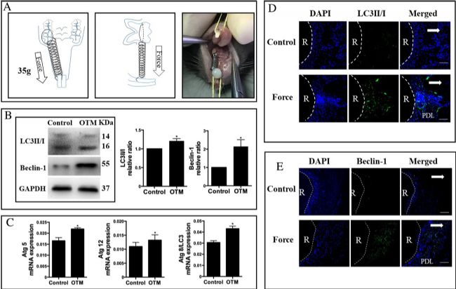 圖 1 在正畸力作用下,PDL 組織中的自噬增加