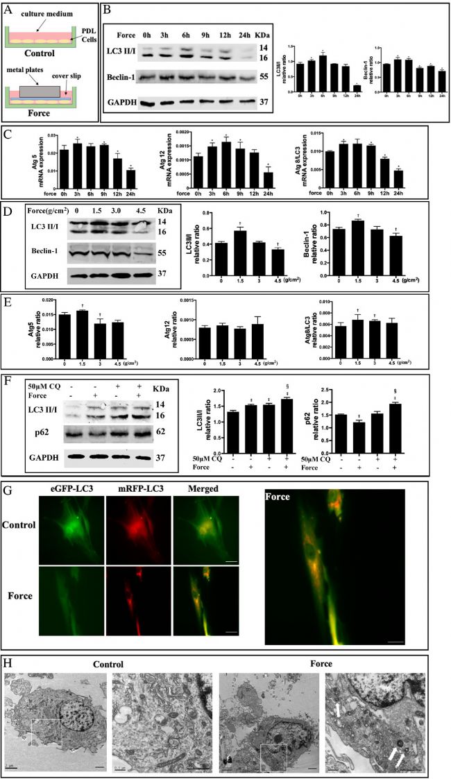 接下來,用 mRFP-GFP-LC3 腺病毒處理 PDL 細(xì)胞。在 1.5 g/cm2壓力后,每個(gè)細(xì)胞的 mRFP 陽性自噬體和雙陽性自噬體的數(shù)量均顯著增加(圖2 G)。