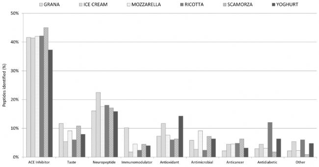 許多研究證明,各種動物和植物基質(zhì)含有生物活性肽,它們的日常食用與降低患慢性疾病的風(fēng)險有關(guān)。特別是,牛奶和乳制品被認為是多肽的最重要來源,能夠調(diào)節(jié)生理和代謝功能,從而對人類健康產(chǎn)生有益影響。與蛋白質(zhì)相比,多肽代表了更高生物利用度的(必需)氨基酸形式,并且可以發(fā)揮多種促進健康的作用,包括礦物質(zhì)轉(zhuǎn)運、免疫調(diào)節(jié)、抗高血壓、抗菌和抗氧化活性。