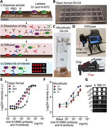 高靈敏度、特異性和即時(shí)(POC)血清學(xué)檢測是2019年冠狀病毒疾。–OVID-19)的一個(gè)重要工具。在這里,我們報(bào)告了一種微流控POC測試,它可以從60微升的血液、血漿或血清中同時(shí)分析針對多種嚴(yán)重急性呼吸道綜合征冠狀病毒2(SARS-CoV-2)抗原--尖峰S1(S1)、核衣殼(N)和受體結(jié)合域(RBD)的抗體反應(yīng)。我們評估了來自31名重癥COVID-19患者(縱向采樣)、41名健康個(gè)體和18名患有季節(jié)性冠狀病毒感染者的血漿樣本中的抗體水平。這種POC測定實(shí)現(xiàn)了較高的敏感性和特異性,可跟蹤血清轉(zhuǎn)化并與活病毒微量中和測定顯示出良好的一致性。我們還能在同一芯片上檢測出嚴(yán)重程度的預(yù)后性生物標(biāo)志物IP-10(干擾素-γ誘導(dǎo)蛋白10)。由于我們的檢測需要最少的用戶干預(yù)并由一個(gè)手持式檢測器讀取,因此它可以在全球范圍內(nèi)部署以對抗COVID-19。