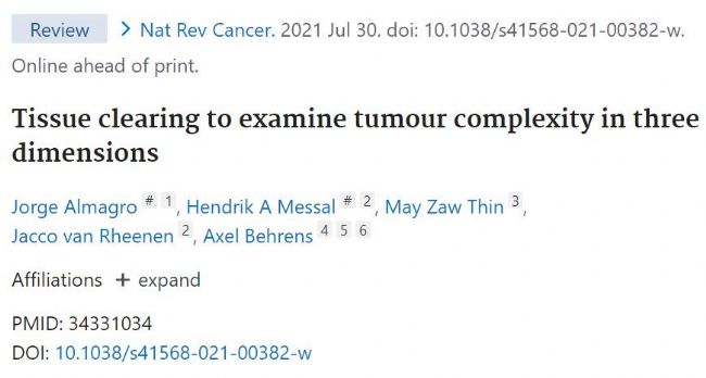 [1] Almagro J, Messal HA, Zaw Thin M, van Rheenen J, Behrens A. Tissue clearing to examine tumour complexity in three dimensions. Nat Rev Cancer. 2021 Jul 30. doi: 10.1038/s41568-021-00382-w. Epub ahead of print. PMID: 34331034.