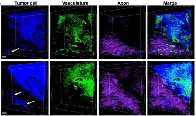 組織透明化方法在近十年內(nèi)迅速發(fā)展,各種化合物的聯(lián)合使用已被廣泛用于減少光散射和光吸收,并增加光學(xué)顯微鏡在成像中的成像深度。雖然組織透明化最初由神經(jīng)科學(xué)家用于描繪小鼠中樞和外周的神經(jīng)系統(tǒng),而近幾年的研究表明,對(duì)于組織的三維成像也可助力發(fā)育生物學(xué)、免疫學(xué)、腫瘤學(xué)和腫瘤機(jī)理等多種學(xué)科。例如腫瘤研究中,三維熒光成像已被用于評(píng)估腫瘤遷移性、腫瘤組織結(jié)構(gòu)、細(xì)胞異質(zhì)性、表征腫瘤微環(huán)境和評(píng)估腫瘤模型的治療反應(yīng)等。