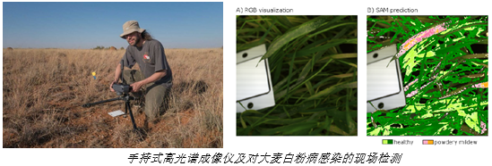 手持式高光譜成像儀可對葉片和冠層水平的作物進(jìn)行二維高光譜數(shù)據(jù)的采集,并通過內(nèi)置APP對病害等脅迫進(jìn)行現(xiàn)場在線檢測。