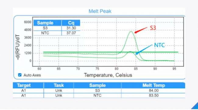 ▲ 圖1:溶解曲線主峰位置基本一致時(shí),S3是實(shí)驗(yàn)樣品,NTC是陰性對(duì)照,
