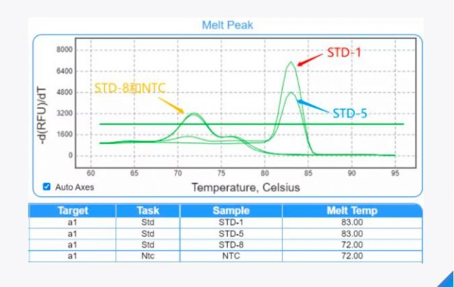 STD-8是低濃度樣品,NTC是陰性對(duì)照。隨著模板濃度降低逐漸出現(xiàn)引物二聚體,