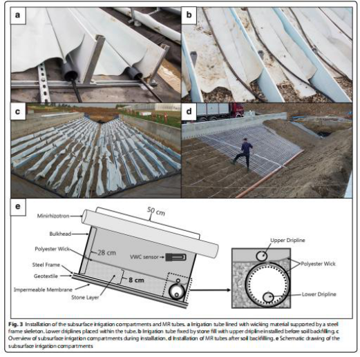 結(jié)果:研究人員開(kāi)發(fā)了一種新型表型設(shè)施(RadiMax)用于在半田間條件下研究根系生長(zhǎng)以及土壤資源獲取。設(shè)施包括4個(gè)單元,每個(gè)單元面積為400m2,分別安裝有150根微根管,允許對(duì)0.4 m–1.8 m或 0.7 m–2.8 m土壤深度間隔的根進(jìn)行觀察。根系觀測(cè)通過(guò)多光譜微根光成像系統(tǒng)實(shí)現(xiàn)。植物生長(zhǎng)行與水分梯度垂直,設(shè)施安裝有多深度亞灌溉系統(tǒng)以及移動(dòng)雨棚。水梯度可實(shí)現(xiàn)將根觀測(cè)與冠層脅迫反應(yīng)進(jìn)展相關(guān)聯(lián)。