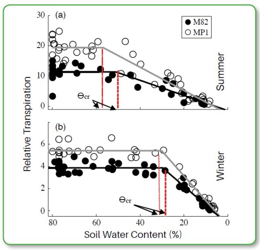 圖2.全部期間2種西紅柿栽培種的全植物蒸騰-土壤水含量的函數(shù):(a) 夏天和(b) 冬天干