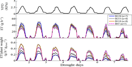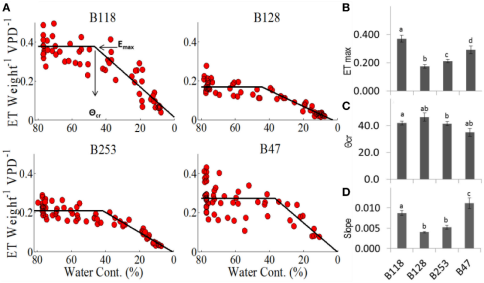 對于每個基因型,TW與SWC的曲線圖顯示了一個明顯的、恒定的午間蒸騰水平(Emax),直到土壤含水量達(dá)到一個臨界值(θcr),此時蒸騰速率出現(xiàn)下降(圖3A,B)。這種ETW(SWC)模式表明,只有當(dāng)SWC<θcr時,土壤水分有效性才成為一個限制因素,并且在土壤水分逐漸枯竭的情況下,每一次入滲都具有保持最大蒸騰速率的獨(dú)特能力。B47和B128線可能對土壤水分虧缺最敏感和最不敏感,因為它們表現(xiàn)出最高和最低的θcr值(圖3C,D)。B47 在達(dá)到 θcr 后也顯示出最高的 ET 下降率(圖 3D)表明該線達(dá)到了最有效的脫水避免響應(yīng)。