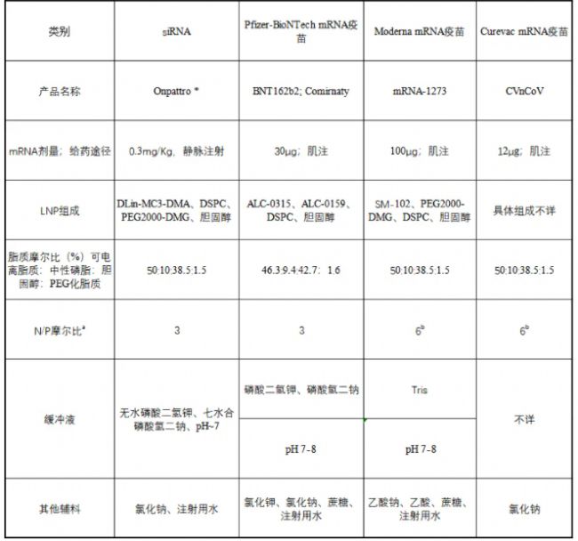 表1 有關(guān)目前上市使用或臨床 III 期試驗的三種 mRNA-LNP疫苗的信息,出于比較原因,添加了 Onpattro(一種 siRNA-LNP 藥物產(chǎn)品)的藥物產(chǎn)品信息。