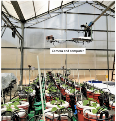 圖2.實(shí)驗(yàn)臺和上方移動的高光譜相機(jī)的視圖。每株植物都放置在一個(gè)與Plantarray 3.0系統(tǒng)相連的自定義稱重蒸滲儀中。四個(gè)滴灌頭對每株植物進(jìn)行灌溉,同時(shí)使用塑料蓋限制水分蒸發(fā)。