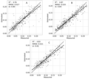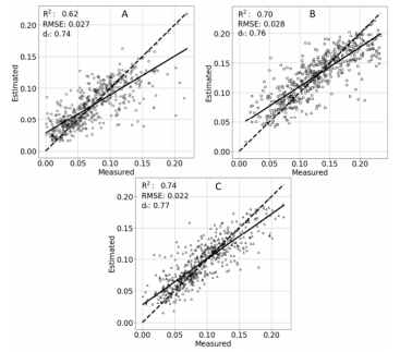 開發(fā)的最終模型與鉀對TR估算的影響有關(guān),如圖6所示。雖然估算之間的RMSE差異很小,但中鉀處理TR的最佳估算值R2=0.87、RMSE=0.02和dr=0.84。高鉀處理TR的估算值R2=0.83、RMSE=0.021和dr=0.81。最后用R2=0.76、RMSE=0.027和dr=0.80估算低鉀處理TR。