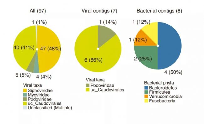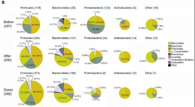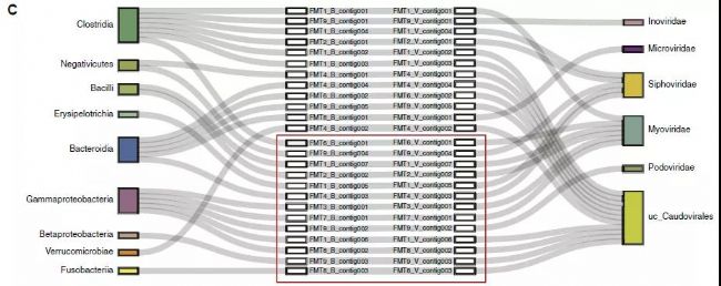 提取細(xì)菌和病毒的contigs獲取原噬菌體的序列,根據(jù)宿主細(xì)菌對(duì)原病毒進(jìn)行分類發(fā)現(xiàn)(圖2A),隨治療后細(xì)菌豐富度和多樣性增加,原噬菌體數(shù)量增加;厚壁菌門和擬桿菌門中的原噬菌體增加,但變形菌門中的原噬菌體逐漸減少甚至消失。結(jié)果也進(jìn)一步表明原噬菌體數(shù)量和組成與細(xì)菌變化一致。根據(jù)細(xì)菌目水平對(duì)原噬菌體進(jìn)行分類的結(jié)果表明 (圖2B),治療前,46%變形菌門來源的原噬菌體為有溶菌噬菌體功能的Myoviridae,少量厚壁菌門和擬桿菌門來源的原噬菌體為Microviridae,沒發(fā)現(xiàn)p-crAssphage或crAss-like噬菌體。那么原噬菌體是否存在于受體的病毒顆粒?對(duì)宿主每個(gè)病毒片段的contig進(jìn)行分析(圖2C),獲取25個(gè)有相關(guān)性的細(xì)菌-噬菌體,且每個(gè)原噬菌體來源的細(xì)菌序列contig只對(duì)應(yīng)一個(gè)病毒contig,此外每個(gè)細(xì)菌contig只對(duì)應(yīng)一個(gè)綱,每個(gè)環(huán)狀病毒contig與一個(gè)病毒目或科相關(guān);與宿主細(xì)菌在治療后消失一致,有13個(gè)細(xì)菌-噬菌體的相關(guān)性在治療后消失。