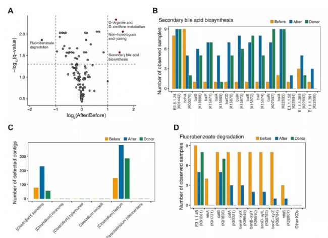 KEGG功能研究發(fā)現(xiàn)(圖4A),糞菌移植后,次級(jí)膽汁酸生物合成,精氨酸和鳥氨酸代謝等通路富集,氟苯甲酸酯(fluorobenzoate)降解通路降低。對(duì)次級(jí)膽汁酸生物合成通路相關(guān)基因研究看出(圖4B),F(xiàn)MT有利于受體細(xì)菌獲取次級(jí)膽汁酸合成相關(guān)的基因(如baiB和baiF)。對(duì)與次級(jí)膽汁酸合成相關(guān)的細(xì)菌的研究發(fā)現(xiàn)(圖4C),Clostridium scindens和Clostridium leptum在治療后升高。