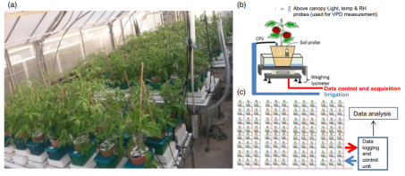 本文提出了一個(gè)簡(jiǎn)單有效的高通量實(shí)驗(yàn)平臺(tái),用于同時(shí)和連續(xù)在動(dòng)態(tài)環(huán)境條件下監(jiān)測(cè)眾多植物的土壤-植物-大氣連續(xù)體中的水分關(guān)系。該系統(tǒng)在正常、脅迫和恢復(fù)條件以及任意物候階段,可以在幾分鐘到整個(gè)生長季節(jié)的時(shí)間段內(nèi)為陣列中的每株植物提供同步測(cè)量的詳細(xì)生理響應(yīng)概況。陣列中每個(gè)盆的三個(gè)探針和專門設(shè)計(jì)的算法能夠?qū)θ参镎趄v作用、生物量增益、氣孔導(dǎo)度和根通量進(jìn)行詳細(xì)的水分關(guān)系表征。它們還可以在動(dòng)態(tài)土壤和大氣條件下以高分辨率定量計(jì)算整個(gè)植物的水分利用效率和相對(duì)含水量。該系統(tǒng)沒有移動(dòng)部件,可以適應(yīng)許多生長環(huán)境。本文使用該系統(tǒng)和傳統(tǒng)的氣體交換工具篩選了與栽培番茄 (S. lycopersicum) 雜交的野生番茄物種 (Solanum pennellii) 的 65 個(gè)基因滲入系,證實(shí)了該系統(tǒng)的準(zhǔn)確性及其診斷能力。鑒于我們對(duì)整株性能的遺傳調(diào)控的理解存在差距,特別是在非生物脅迫下,討論了這種高通量診斷篩選方法的使用。