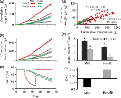 在灌溉良好的條件下,M82的生長速度和蒸騰速率均高于Penelli。在干旱條件下,M82植物的生長速率和累積蒸騰量下降速度比 Penelli 植物快得多(圖 2a、b)。當(dāng)植物暴露于干旱時(shí),與含有 Penelli 植物的盆栽相比,M82 較高的蒸騰速率導(dǎo)致 SWC 減少得更快(圖 2c)。與 Penelli 相比,M82 較高的蒸騰速率和生物量增加導(dǎo)致用水分利用效率(WUE)顯著降低(圖 2d)。M82更高的蒸騰速率不僅與其較大的尺寸有關(guān),還與每單位葉面積的更多蒸騰量有關(guān),因?yàn)樵趯?duì)照和干旱條件下,標(biāo)準(zhǔn)化為葉面積 (E) 的蒸騰速率也高于Penelli 植物。在類似的 SWC 條件下,Penelli 植物對(duì)干旱的響應(yīng)比 M82 植物更急劇地減少 E(圖 2e)。當(dāng)植物的蒸騰速率以及整個(gè)冠層氣孔導(dǎo)度 gsc 標(biāo)準(zhǔn)化為植物的重量時(shí),獲得了類似的相對(duì)行為。與 Penelli 植物相比,M82 植物更大的冒險(xiǎn)行為(即氣孔響應(yīng)對(duì) SWC 減少的敏感性較低)產(chǎn)生較低的抗旱指數(shù)(DRI)(圖 2f)。當(dāng)植物達(dá)到所需的SWC 時(shí),所有測(cè)量都需要大約 2-3 小時(shí)。在圖 2(e) 中,M82 和 Penelli 的數(shù)據(jù)平均如下: M82 和 Penelli 在種植后 29天(即預(yù)處理的最后一天)取 80% SWC(盆栽容量);由于 M82 和 Penelli 在不同時(shí)間達(dá)到 45% SWC,我們?cè)诿總(gè)植株達(dá)到 SWC 目標(biāo)時(shí)進(jìn)行測(cè)量。