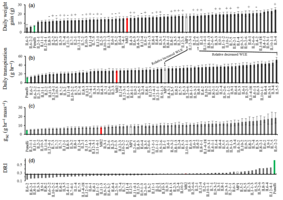 比較第一個(gè)和第二個(gè)板塊之間每條線的相對(duì)位置交換(分別如圖3a、b所示)提供其相對(duì)WUE。因此,WUE水平較高的植物在生長速率板塊上的具有較高的位置(圖3a),而在累積蒸騰板塊上的位置相對(duì)較低(圖3b;e、例如,行MP1),反之亦然(例如IL5-5)。另一個(gè)定性參數(shù)可以從第二個(gè)和第三個(gè)板塊之間的相對(duì)位置移動(dòng)中得出[即整個(gè)植物蒸騰量(圖3b)與其在蒸騰作用標(biāo)準(zhǔn)化葉面積圖(gsc,圖3c)上的相對(duì)位置之間的位置互換]。而IL6-2和IL6-2-2從圖3(b)的右端到圖3(c)的左端急劇向右移動(dòng),可能表明氣孔控制出現(xiàn)問題。事實(shí)上,兩個(gè)遺傳相似的品系都具有很低的DRI(圖3d)和很強(qiáng)的萎蔫表型,但并非所有遺傳相似的IL植物都表現(xiàn)出相似的表型。