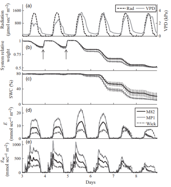 測(cè)量的全株蒸騰速率(E) 和冠層蒸汽傳導(dǎo)率 (gsc) 在廣泛的SWC值(圖4)下產(chǎn)生的MP1與M82的值始終較高。 在冬季重復(fù)實(shí)驗(yàn) [溫室中的蒸汽壓差 (VPD) 類似,但由于自然光條件導(dǎo)致輻射減少約 30%],最大E和gsc的值較低,具有類似的行為植物之間的模式以及植物對(duì)不同環(huán)境條件的反應(yīng)。冠層氣孔導(dǎo)度的每日峰值gsc(圖4e)早于VPD的每日峰值(圖4a)。
