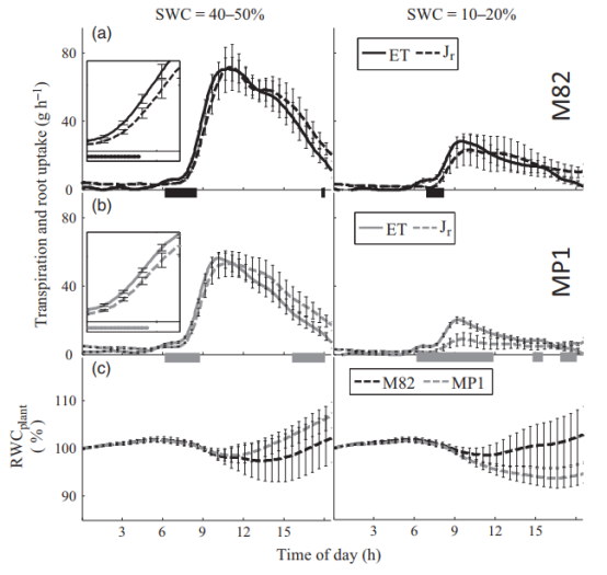 當(dāng)前篩選系統(tǒng)的另一個(gè)重要特征是通過同時(shí)測(cè)量流入根部(Jr)和流出樹冠(ET)的水流量來評(píng)估連續(xù)的全株水分平衡表型;圖5)。Jr通過連續(xù)測(cè)量SWC(使用土壤探針)進(jìn)行評(píng)估,ET通過蒸滲儀連續(xù)測(cè)定的重量進(jìn)行評(píng)估。ET和Jr的連續(xù)測(cè)量提供了兩種通量之間的時(shí)間差異以及其隨時(shí)間變化的視圖。進(jìn)水量和出水量之間的差異被視為衡量整個(gè)植株相對(duì)含水量(RWC)變化的指標(biāo)。兩個(gè)通量之間的差異表明RWC正在減少或增加(圖5c和實(shí)驗(yàn)程序)。一般而言,兩條線路在清晨時(shí)段的出水量均高于入水量。流入和流出在上午晚些時(shí)候達(dá)到平衡并持續(xù)到中午時(shí)段。 在下午時(shí)間段中,進(jìn)水量高于出水量。MP1和M82植物的每日RWC模式之間的比較表明,在40-50% SWC時(shí)MP1的每日RWC增益更大(圖5c)。然而,在嚴(yán)重脅迫下MP1植物比M82植物經(jīng)歷了更嚴(yán)重的RWC損失。這些觀察結(jié)果與手動(dòng)測(cè)量葉片的RWC以及生長速率模式一致。