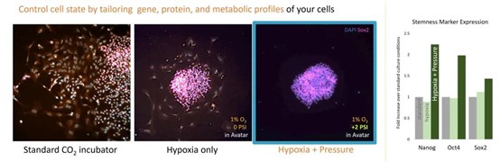 利用AVATAR保留細(xì)胞干性。干細(xì)胞研究中,利用傳統(tǒng)方法維持細(xì)胞的干性相當(dāng)困難,AVATAR系統(tǒng)解決了這一難題。絕大多數(shù)基因的表達(dá)受到氧氣與壓力的調(diào)控,如Figure10顯示,維持細(xì)胞干性相關(guān)的三個基因Nanog,Oct4,和Sox2在AVATAR低氧高壓的環(huán)境下,相比常規(guī)環(huán)境表達(dá)量更高,從而可以很好地維持細(xì)胞的干性,確保其不分化。