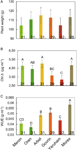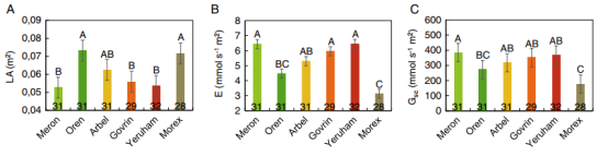 本文比較了在最佳條件下一起生長的這六個(gè)種質(zhì)的植物之間的幾個(gè)QPT。六個(gè)種質(zhì)的平均植株重量之間沒有顯著差異(圖2A)。然而,南方種質(zhì)的葉子中Chlb的濃度顯著降低(圖2B)。比較不同種質(zhì)的WUE顯示,栽培品系Morex的WUE最高,為0.058 g ml-1(即每毫升蒸騰量增加 5.8% 的生物量),而Oren 種質(zhì)的WUE最低,為3.7%。盡管不同種質(zhì)的原生棲息地之間存在地理距離,并且這些棲息地的年降雨量模式不同(Hübner等2009),但Mt. Meron和Yeruham種質(zhì) WUE值分別為4% 和4.3%(圖2C)。