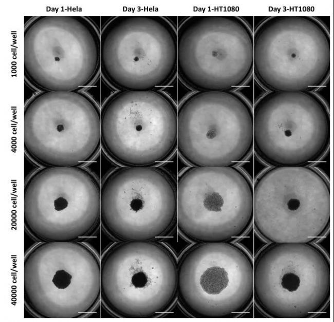 圖 2. HT-1080 和 HeLa 細(xì)胞系的球體形成和生長,在 µ-Plate Angiogenesis 96 孔中以不同的初始細(xì)胞濃度接種。 (比例尺:800 µm)