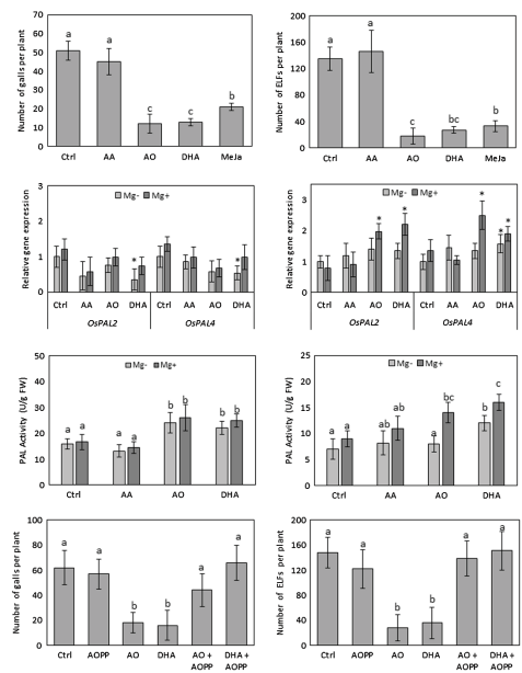 本文中葉面AA、AO或DHA處理對水稻植株的影響通過計算蟲癭的數(shù)量得到獨立證實,并通過計算產(chǎn)卵雌性(ELF)的總數(shù)得到擴展。與模擬噴灑植物進行比較,在水稻植株上葉面施用AO和DHA可顯著減少接種后14天記錄的蟲癭數(shù)量(圖1A),噴灑AO和DHA也減少了ELF的數(shù)量(分別減少87%和80%;圖1B)。噴灑AA不會引起蟲癭(圖1A)或ELF(圖1B)數(shù)量的任何顯著變化。