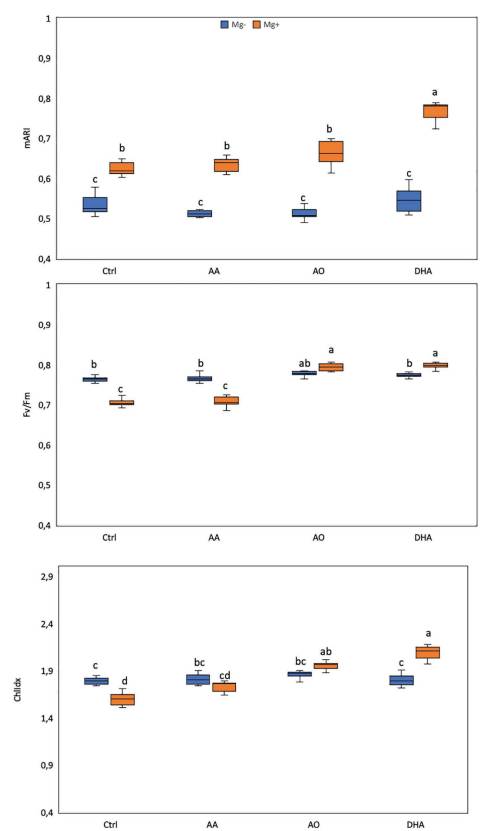 與未感染的植物相比,在所有處理中,線蟲感染植物的枝條中通常觀察到顯著更高的mARI 值,(圖2A)。數(shù)據(jù)進一步顯示,與所有其他處理相比,線蟲攻擊后 DHA 噴灑植物的 mARI 值顯著增加(圖 2A)。觀察 Fv/Fm,與未感染植物的枝條相比,線蟲感染植物枝條的值顯著降低,但僅當(dāng)植物被模擬噴灑或噴灑 AA 時(圖 2B)。相反,與模擬噴霧或 AA 噴霧植物的枝條相比,AO 或 DHA 噴霧感染植物枝條的 Fv/Fm 值顯著增加(圖2B)。確認(rèn)降低的 Fv/Fm,數(shù)據(jù)還顯示與未感染植物相比,模擬噴霧感染植物的枝條中 ChlIdx 的值顯著降低(圖 2C)。