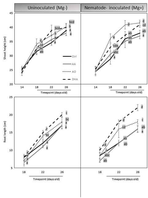 在噴灑前(14 天)測量植物,然后在 18、22 和 26 天時使用(Mg+)或不使用(Mg-)再次測量以監(jiān)測它們的生長。在第18天和第26天(圖3A),未處理的感染 (Mg+) 植物與 Ctrl (Mg-) 相比,在未處理的感染 (Mg+) 植物中觀察到枝條高度略有下降(30%,不顯著),這說明線蟲感染對地上水稻生長。然而,當(dāng)植物預(yù)先噴灑 AO 或 DHA 時,這種效果就被抵消了。在 26 天時,與未處理的感染植物 (Mg+) 相比,在 AO 或 DHA 噴灑的植物中,在線蟲感染 (Mg+) 下,芽高度顯著增加(圖 3A)。早在噴灑后 4 天就觀察到 AO/DHA 對枝條高度的積極影響,但線蟲感染的植物 (Mg+) 比未接種的 (Mg-) 植物強得多。與未處理或噴灑 AA 的植物相比,AO/DHA 處理的植物在 22 天和 26 天時根長顯著增加,這種效果似乎主要是在線蟲感染條件下放大了(圖3B)。