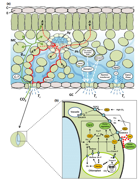 蔗糖被認為是參與葉肉光合作用和保衛(wèi)細胞滲透調(diào)節(jié)之間協(xié)調(diào)的潛在代謝物。然而,在探索涉及蔗糖信號的潛在機制之前,重要的是概述氣孔滲透調(diào)節(jié)以及糖在保衛(wèi)細胞和氣孔行為中的作用和來源,因為這些也有可能提供信號或機制/途徑。