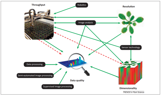 圖2.通量、分辨率和維數(shù)是植物表型系統(tǒng)的關(guān)鍵方面,影響著數(shù)據(jù)質(zhì)量
