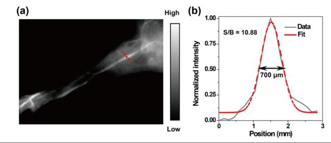 靜脈注射CH1-SV40,2分鐘后對小鼠的后肢血光系統(tǒng)成像,在808nm激光的照射下,顯示出清晰的小鼠血管圖像,信噪比可達10.88,該合成的探針具優(yōu)秀的血管成像能力。