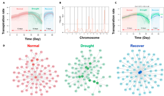 圖3.控制蒸騰速率的動(dòng)態(tài)QTL和QTL網(wǎng)絡(luò)