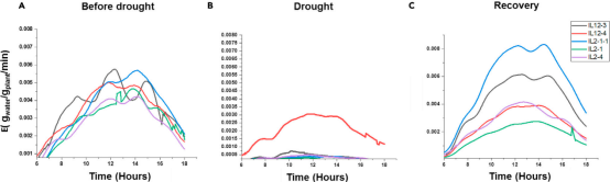 FPP-FM 的第一步是從自然或譜系種群中獲取動(dòng)態(tài)數(shù)量生理特征數(shù)據(jù)。在這里,所使用的群體是番茄的基因滲入型群體,該群體受到包括正常灌溉、逐步干旱和高通量自動(dòng)表型系統(tǒng)中的水分恢復(fù)的處理方案的影響(圖1)。在整個(gè)試驗(yàn)過程中,隨著脅迫參數(shù)的變化,不斷記錄多個(gè)干旱響應(yīng)性狀的表型數(shù)據(jù),如植株重量和轉(zhuǎn)錄率。Halperin 等人已經(jīng)發(fā)表了對該FPP 過程的詳細(xì)描述。為了合理的計(jì)算強(qiáng)度,本文以蒸騰速率 (Tr) 為例來說明我們提出的框架如何將動(dòng)態(tài)表型信息轉(zhuǎn)化為遺傳知識(shí)。在圖 2A-2C 中,顯示了來自五個(gè)隨機(jī)選擇的 IL 系的蒸騰速率的動(dòng)態(tài)模式,每三分鐘記錄一次,包括干旱前(圖2A)、干旱脅迫(圖2B)和恢復(fù)階段(圖2C)。已知蒸騰速率與干旱脅迫下的產(chǎn)量損失相關(guān)。截留水分后,觀察到所有五個(gè)品系的蒸騰速率都顯著降低(圖2B),而敏捷性和響應(yīng)幅度的基因型差異是明顯的。恢復(fù)供水后,觀察到恢復(fù)模式的顯著基因型差異,然而這與響應(yīng)缺水的植物行為無關(guān)。例如,IL2-1-1系在干旱脅迫下保持最高的蒸騰速率(圖2B),但在重新澆水后其恢復(fù)能力較弱(圖 2C)。