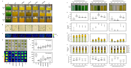 光合作用很容易受到強光(HL)水平的損害,光合生物已經(jīng)進化出各種機制來應對高光脅迫。Dann等人通過實驗室適應進化(ALE)顯著提高了藍藻集胞藻的耐光性。通過MC 1000多通道藻類培養(yǎng)與在線監(jiān)測系統(tǒng)對藻液培養(yǎng),同時使用Fluorcam葉綠熒光成像系統(tǒng)測量了F0等多個葉綠素熒光參數(shù)。通過反復突變和增加光照強度,篩選了能夠在極高光強下生長的菌株。
