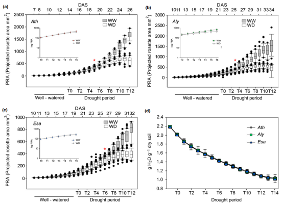 根據(jù)預(yù)測(cè)玫瑰花結(jié)面積(PRA)確定了隨時(shí)間的增長(zhǎng)。盡管這三個(gè)物種都對(duì)水資源利用率的降低做出了反應(yīng),花環(huán)生長(zhǎng)也減少了,但它們的動(dòng)態(tài)卻有很大的不同。Aly在T3時(shí)首先對(duì)缺水作出反應(yīng),而Ath和Esa僅在T5和T6時(shí)表現(xiàn)出顯著的生長(zhǎng)減少(圖2a-c)。而在治療的第一天(T0),Aly PRA(211 mm2)明顯大于Esa(94 mm2)和Ath(100 mm2)。然而,較大的Aly花環(huán)在停止?jié)菜蟛](méi)有導(dǎo)致較高的耗水量(圖2d),這可能是生長(zhǎng)減少較快的原因。生長(zhǎng)減少時(shí)測(cè)得的土壤含水量分別為1.76(Aly)、1.66(Ath)和1.50(Esa)(圖2d)。因此,盡管預(yù)期這三個(gè)物種都會(huì)因水分利用率的降低而出現(xiàn)生長(zhǎng)減少的反應(yīng),但與敏感的Ath相比,這兩個(gè)抗性物種明顯表現(xiàn)出相反的反應(yīng)動(dòng)力學(xué)。這種不同的反應(yīng)可能表明,盡管Aly和Esa在進(jìn)化上很接近,但它們?cè)诳箲?yīng)激方面進(jìn)化出了不同的策略。