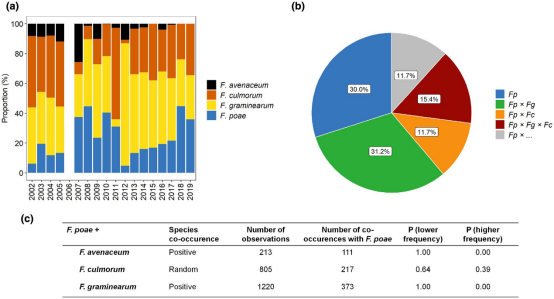 通過分析散布在比利時(shí)佛蘭德斯七個(gè)地點(diǎn)17 年的調(diào)查數(shù)據(jù),本文評估了梨孢鐮刀菌和禾谷鐮刀菌的共存情況?偣苍u估了 7000 多個(gè)小麥穗和 40 多個(gè)栽培品種是否存在 FHB 成員。該分析表明只存在梨孢鐮刀菌癥狀的僅有30.0%的案例,梨孢鐮刀菌伴有禾谷鐮刀菌的案例占比31.2%,伴有禾谷鐮刀菌、黃色鐮刀菌的梨孢鐮刀菌案例占比15.4%(圖1a,b)。