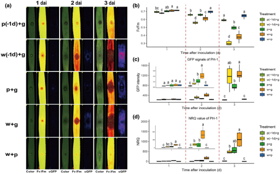 梨孢鐮刀菌預(yù)接種的FV/FM值顯著高于單一禾谷鐮刀菌接種(圖 2a、b)。此外,缺乏癥狀與校正的(c) GFP信號降低一致,反映了禾谷鐮刀菌的存在減少(圖 2a、c)和禾谷鐮刀菌生物量的顯著減少(圖 2d)。最后,由于禾本科鐮刀菌感染期間產(chǎn)生的紅鐮孢菌素導(dǎo)致的典型微紅色在分離的葉子中預(yù)接種梨孢鐮刀菌時(shí)也消失了。在同時(shí)接種禾谷鐮刀菌和梨孢鐮刀菌的雙重接種中,與單一禾谷鐮刀菌感染相比,癥狀明顯較輕。這些結(jié)果通過評估由cGFP信號可視化的禾谷鐮刀菌的存在和活性以及通過定量逆轉(zhuǎn)錄PCR (RT-qPCR) 評估的生物量得到證實(shí)。與禾谷鐮刀菌的單一感染相比,這兩個(gè)參數(shù)在第3天分別顯示出顯著和輕微降低(圖 2c、d)。