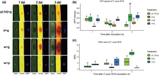 為了了解禾谷鐮刀菌PH-1對梨孢鐮刀菌2,516存在的影響,我們使用了帶有GFP標(biāo)記的梨孢鐮刀菌2,516分離株與野生型禾谷鐮刀菌PH-1并評估了后者的影響。通過用無菌手術(shù)刀在0.1、1和2厘米的長度上刮擦表皮層而在機(jī)械損傷的葉子上接種了帶有 GFP 標(biāo)記的梨孢鐮刀菌,以檢查梨孢鐮刀菌是否受益于禾谷鐮刀菌感染引起的葉片損傷。梨孢鐮刀菌在較大的傷口中顯示出明顯更大的生長。
