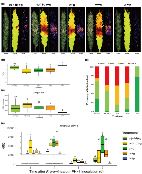 為了驗(yàn)證在小麥穗(FHB 病原體的主要生態(tài)位)中的觀察,本文評估了梨孢鐮刀菌的預(yù)接種是否也減少了穗上禾谷鐮刀菌的感染。因此在用梨孢鐮刀菌接種相同的小穗前 1 或 2 天接種了禾谷鐮刀菌分生孢子懸浮液。感染7天后,在禾谷鐮刀菌前 1或2天用梨孢鐮刀菌預(yù)接種小穗導(dǎo)致FHB癥狀減少的趨勢沒有統(tǒng)計(jì)學(xué)意義,如通過紅-綠-藍(lán)(RGB)圖像測量,較高的FV/FM值(圖4a、b和S9)、低評分癥狀的百分比(圖4d)、禾谷鐮刀菌的cGFP信號降低(圖4a、c和S9)以及禾谷鐮刀菌的減少,通過RT-qPCR 獲得的生物量(圖4e和S9)與禾谷鐮刀菌的單一接種或禾谷鐮刀菌和梨孢鐮刀菌的共接種相比,證實(shí)了從離體葉測定中的發(fā)現(xiàn)。