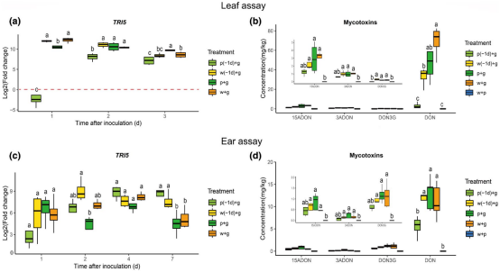 本文分析了禾谷鐮刀菌中TRI5基因的轉(zhuǎn)錄本,這是DON生物合成中的一個(gè)關(guān)鍵基因。在小麥葉測定和小麥穗測定中,在接種梨孢鐮刀菌前1或2天預(yù)接種禾谷鐮刀菌導(dǎo)致與早期感染時(shí)間點(diǎn)的單一禾谷鐮刀菌接種相比顯著降低的TRI5基因表達(dá)水平(第 1天和第2天;圖5a、c)。在較晚的時(shí)間點(diǎn)(葉子測定的第3天,穗測定的第4天和第7天),處理之間TRI5基因相對表達(dá)的差異不太明顯,除了在接種梨孢鐮刀菌前2天接種梨孢鐮刀菌的相互作用禾谷鐮刀菌和在葉片測定中同時(shí)接種這兩個(gè)物種的相互作用。對于禾本科TRI5基因的表達(dá),禾本科的生物量非常低,TRI5的表達(dá)低于檢測水平。